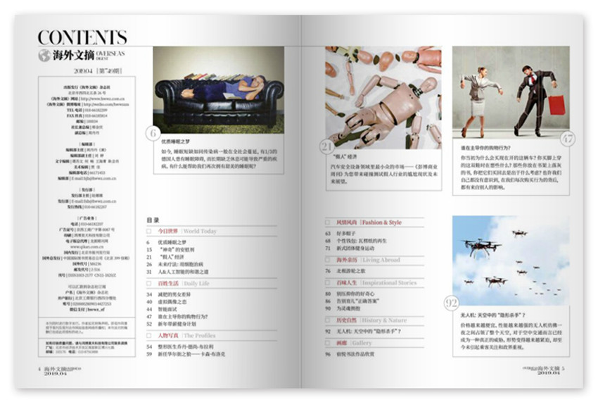 《海外文摘》(月刊)創刊于1984年,多年來雜志內容及形式方面與時俱進,并以其形式和內容的豐富性及多樣性,贏得了不同階層讀者的喜愛與擁護。