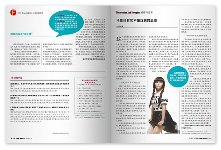 雜志從創刊以來,一直在不停地創新,目的只有一個--滿足讀者的需求。幾年來發行量飛速上升,可我們還是感到有一種危機在時時威脅著我們:科技的進步,互聯網的飛速發展,新媒體不斷的涌現……所以,我們只有一步不停地創新自己。