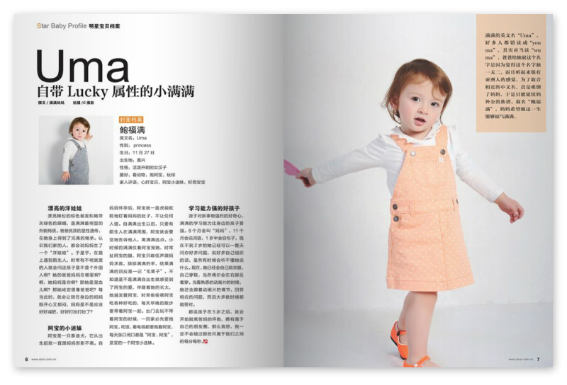 自帶Lucky屬性的小滿滿,封面檔案寶姓名:鮑福滿英文名:Uma性別:princess生日:2011年11月27日出生地:興性格:活潑開朗的女漢子愛好:看動物,抱阿寶,玩球家人評語:心肝寶貝,阿寶小迷妹,奇寶寶滿滿的英文名"Uma”,好多人都錯讀成"you ma”,其實應當讀"wuma”,爸爸給她取這個名字是因為覺得這個名字獨一無二,而且聽起來很有亞洲人的感覺。