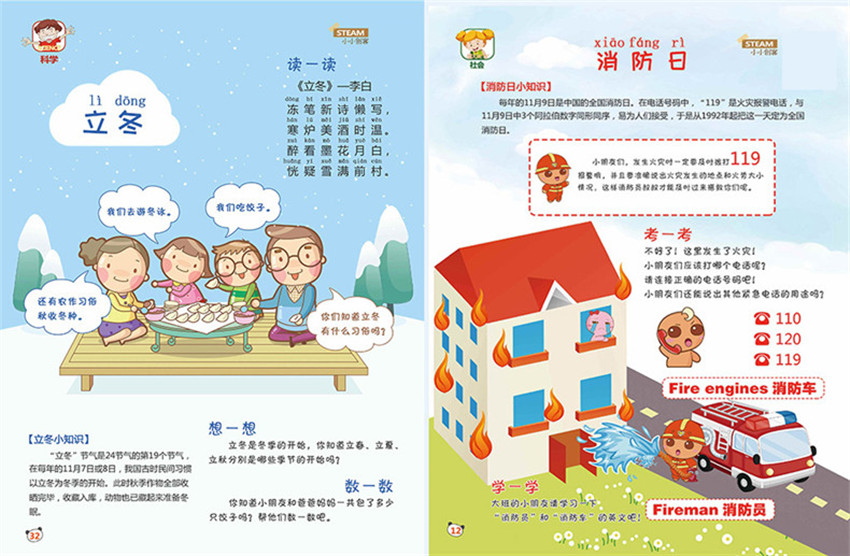 每月根據(jù)當(dāng)月的節(jié)日、季節(jié)、時(shí)令等,設(shè)置不同的學(xué)習(xí)主題。本月刊在感恩節(jié)、消防日、立冬等情境中融入了拼音、英語(yǔ)、填色、數(shù)學(xué)游戲、童謠、安全知識(shí)、詩(shī)歌、科普、繪本等知識(shí)的學(xué)習(xí)。