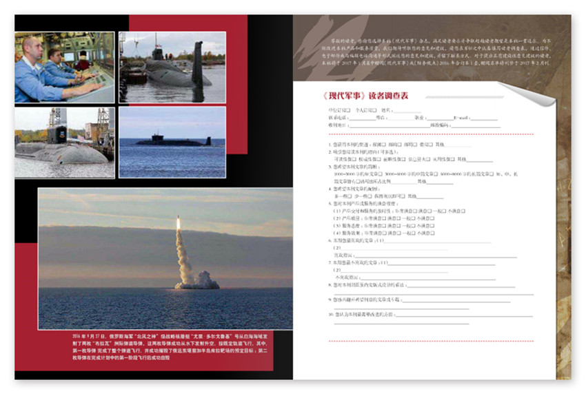 《現(xiàn)代軍事》雜志始終堅持以“傳播軍事信息、普及國防教育、交流軍事技術(shù)、促進(jìn)武器裝備建設(shè)、為國防現(xiàn)代化服務(wù)”為辦刊宗旨,以其性、導(dǎo)向性、理論性、前瞻性、可讀性,深受軍事、政治、經(jīng)濟(jì)研究人員、軍工貿(mào)人員、部隊官兵以及廣大軍事愛好者的喜愛,已成為國內(nèi)外有影響的、我軍武器裝備與軍事技術(shù)領(lǐng)域的性軍事期刊。