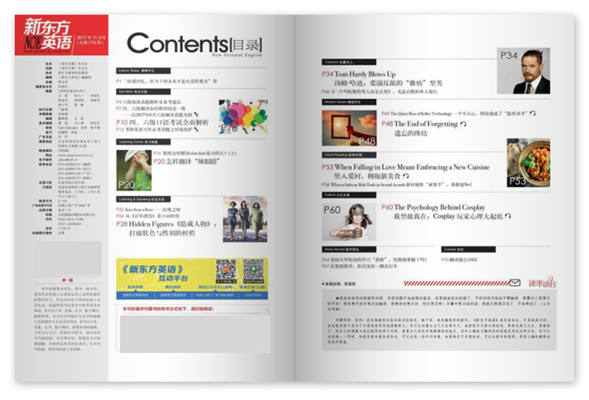《新東方英語》雜志主要內容為實用的考試技巧輔導、的留學資訊、系統的異域文化介紹以及雋永的美文賞析。