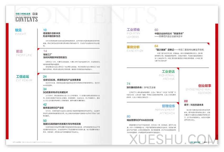 《中國工業和信息化》主要欄目:工經論壇、工業領袖、視野、前沿、管理經緯、專題研究等。