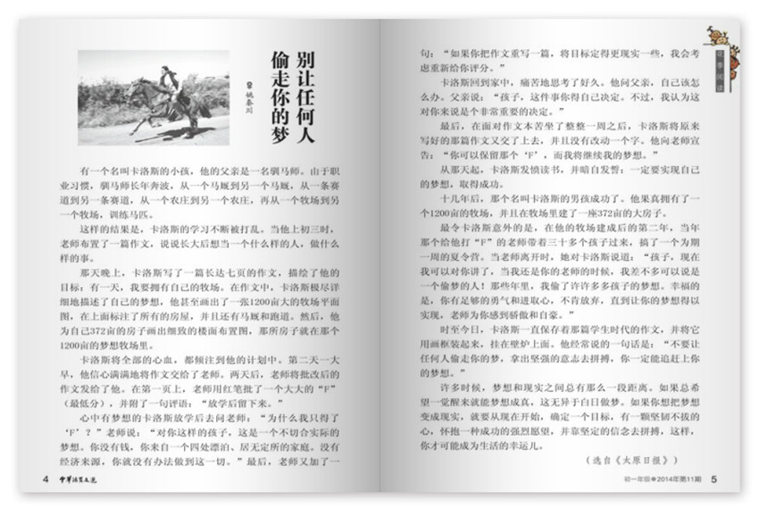 別讓任何人偷走你的夢,有一個名叫卡洛斯的小孩,他的父親是一名馴馬師。由于職業習慣,馴馬師長年奔波,從一個馬廄到另一個馬廄,從一條賽道到另一條賽道,從一個農莊到另一個農莊,再從一個牧場到另一個牧場,訓練馬匹,這樣的結果是,卡洛斯的學習不斷被打亂。當他上初三時,老師布置了一篇作文,說說長大后想當一個什么樣的人,做什么樣的事。