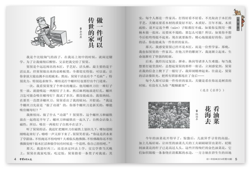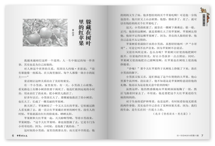 設有課外閱讀積累、中華國學普及、課堂教學拓展、中高考備考和學生習作展示等板塊,以優美、正面、高品質的選文在中小學師生中具有良好口碑,以普及傳統文化為特色,以提升文化素養為目標,分為小學版,初一年級,初二年級,初三年級,高一年級,高二、高三年級和教師版七個版別,供相應讀者選擇,主要欄目:花季閱讀、中華國學、我寫故我在、敘事類記敘、文橋閱讀、新題演練等。