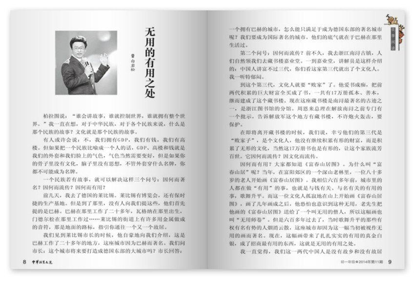 無用的有用之處,柏拉圖說:“誰會講故事,誰就控制世界,誰就擁有整個世界。”我一直在想,對于中華民族,對于各個民族來說,什么是那個民族的故事?文化就是那個民族的故事,有人或許會說:不,我們擁有GDP,我們有錢,我們有高樓。但如果把一個民族比喻成一個人的話,GDP、高樓和錢就是我們的外套和我們臉上的氣色,氣色當然需要變好,但是如果你的骨子里沒有文化,腦子里沒有思想,不管外套穿什么名牌,你都不可能成為名牌。